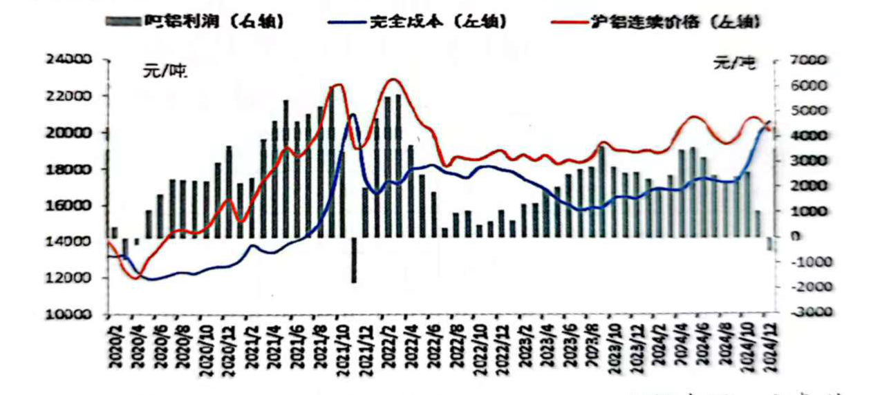 2024年,盡管氧化鋁價格大幅波動導(dǎo)致電解鋁成本重心明顯抬升,但從全年來看,鋁價持續(xù)高位運行,電解鋁行業(yè)依舊維持2000/噸以上的利潤,尤其是在5月份,利潤達(dá)到3581/噸的年內(nèi)最高水平。根據(jù)安泰科測算,2024年中國電解鋁加權(quán)平均完全成本(含稅)17717/噸,同比增加7.4%1223/噸;全年噸鋁平均利潤約為2227元,同比增加0.9%20元。